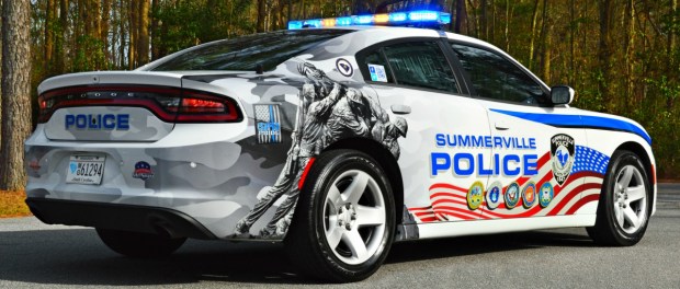 The Summerville Police Department recently took community oriented policing one step further by unveiling a specially designed cruiser to pay tribute to members of the United States Armed Forces. Before explaining more about the vehicles design, it’s important to understand that Summerville is located in a region that has a rich military history. The town is located a few miles from Naval Weapons Station Charleston, U.S. Coast Guard Station Charleston and the Charleston Air Force Base. As a result, not only do many of the residents have ties to the military, but the department itself also employs many veterans, some of which still actively serve through the national guard.